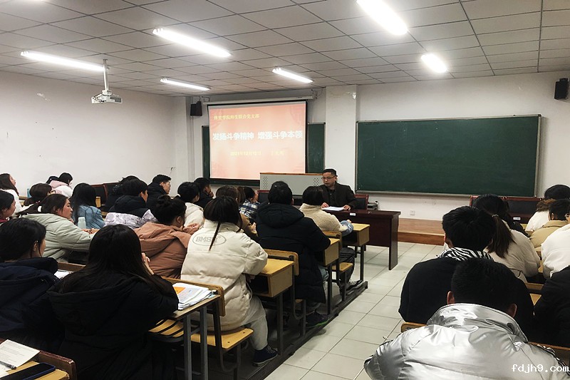 2021年12月12日,体育学院师生联合党支部在体育学院训练馆101教室开展专题党课,学院党委副书记丁光明作“弘扬斗争精神,增强斗争本领”专题报告,师生联合党支部全体党员参加。